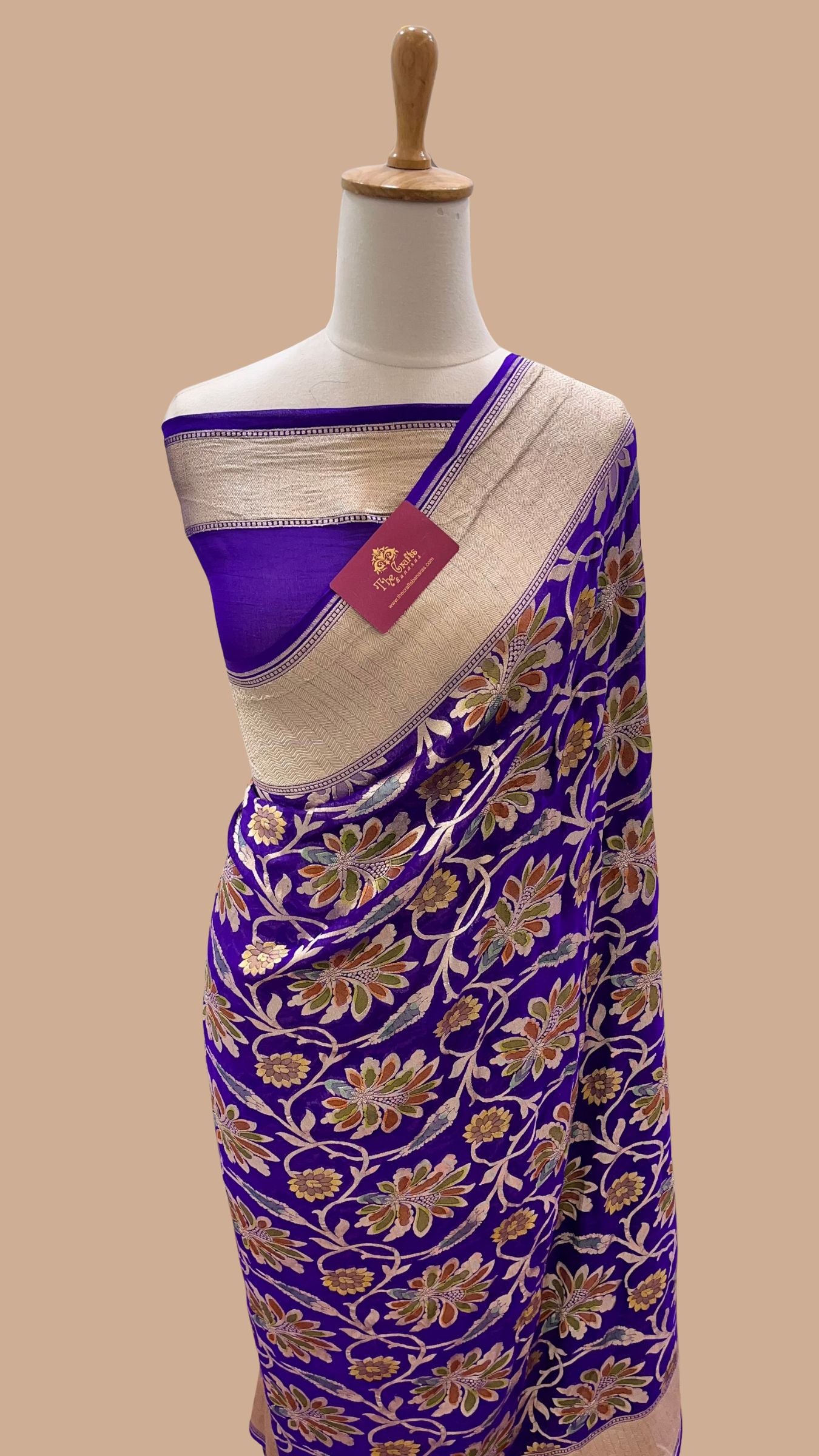 - Work : Elegant silver zari motifs woven in the exquisite kadwa weave, on a dainty palette. Enduring art from Banaras!