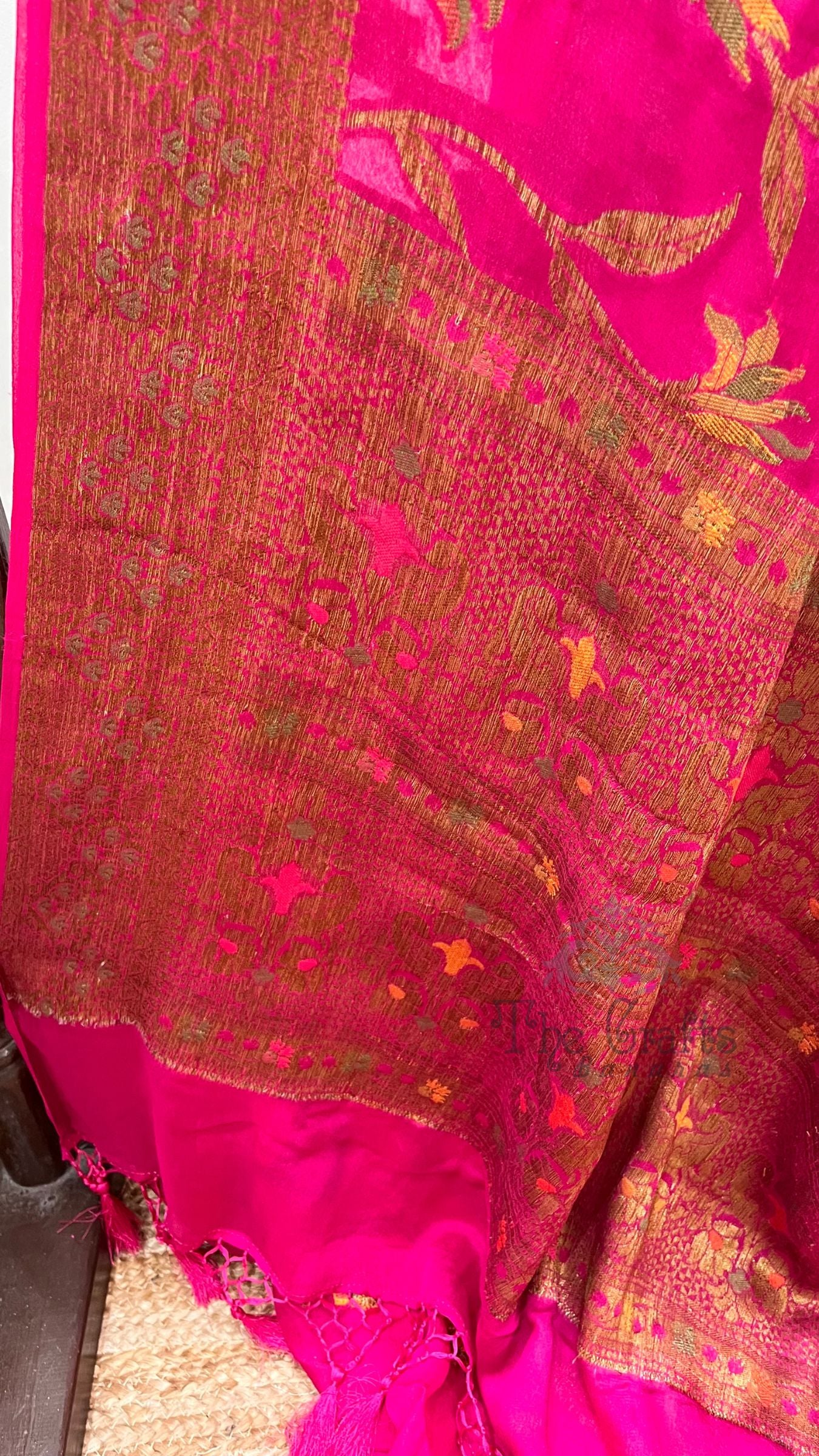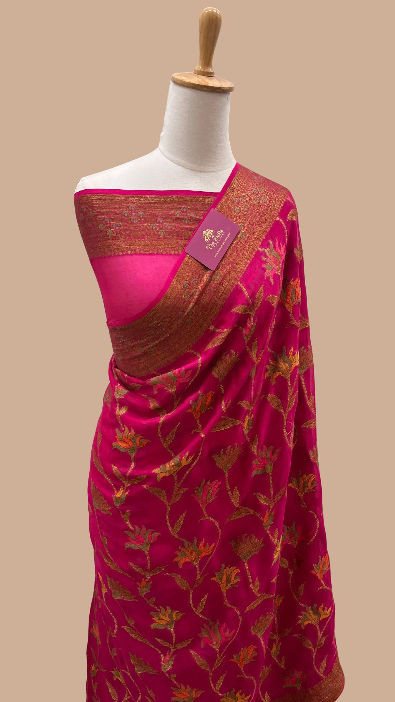 A Beautiful Khaddi Chiffon Banarasi Saree Adorned Zari work all over. It's an elegant classic Banarasi masterpiece. This free-flowing chiffon saree gives a charming and alluring look on drape.