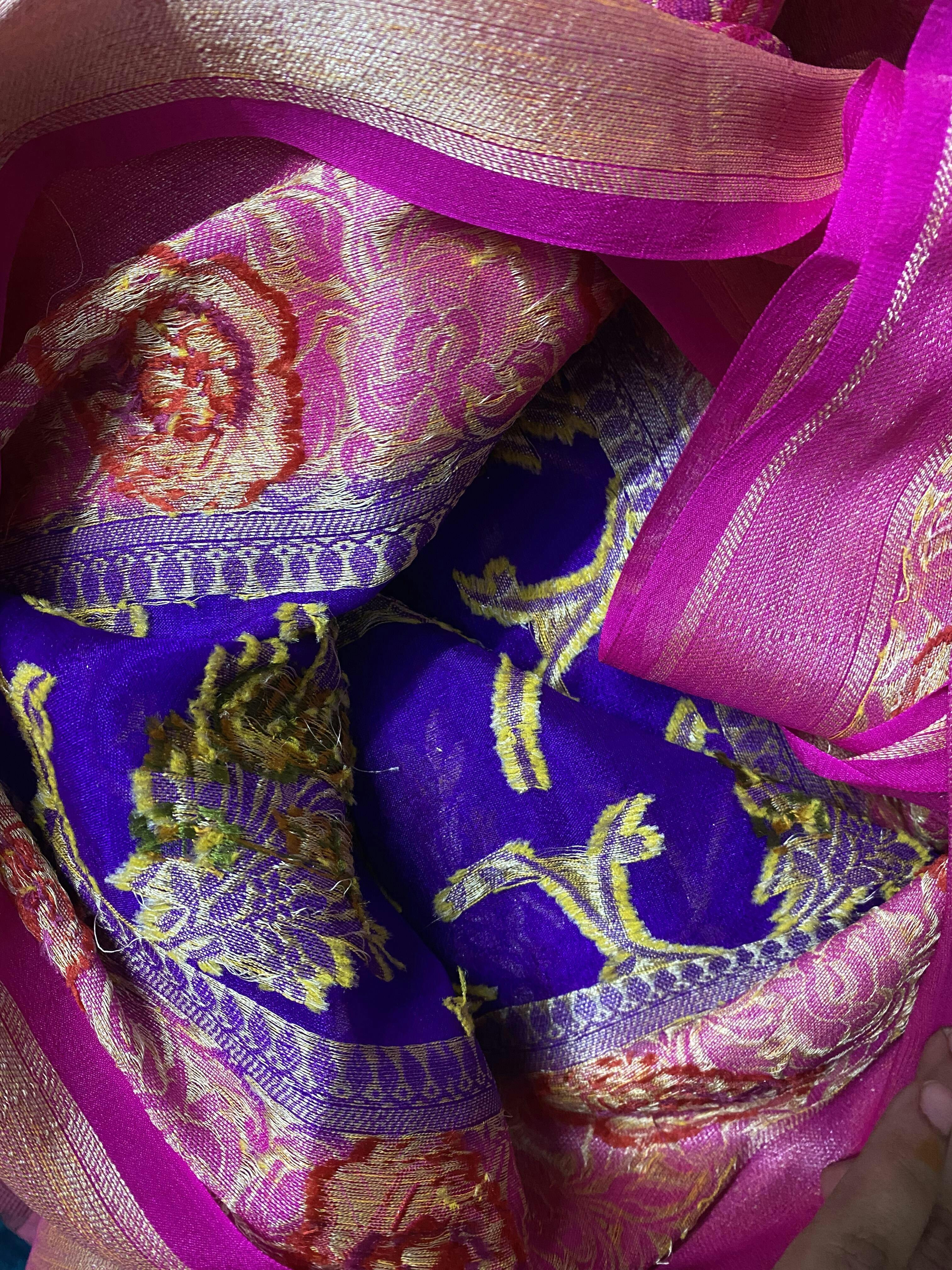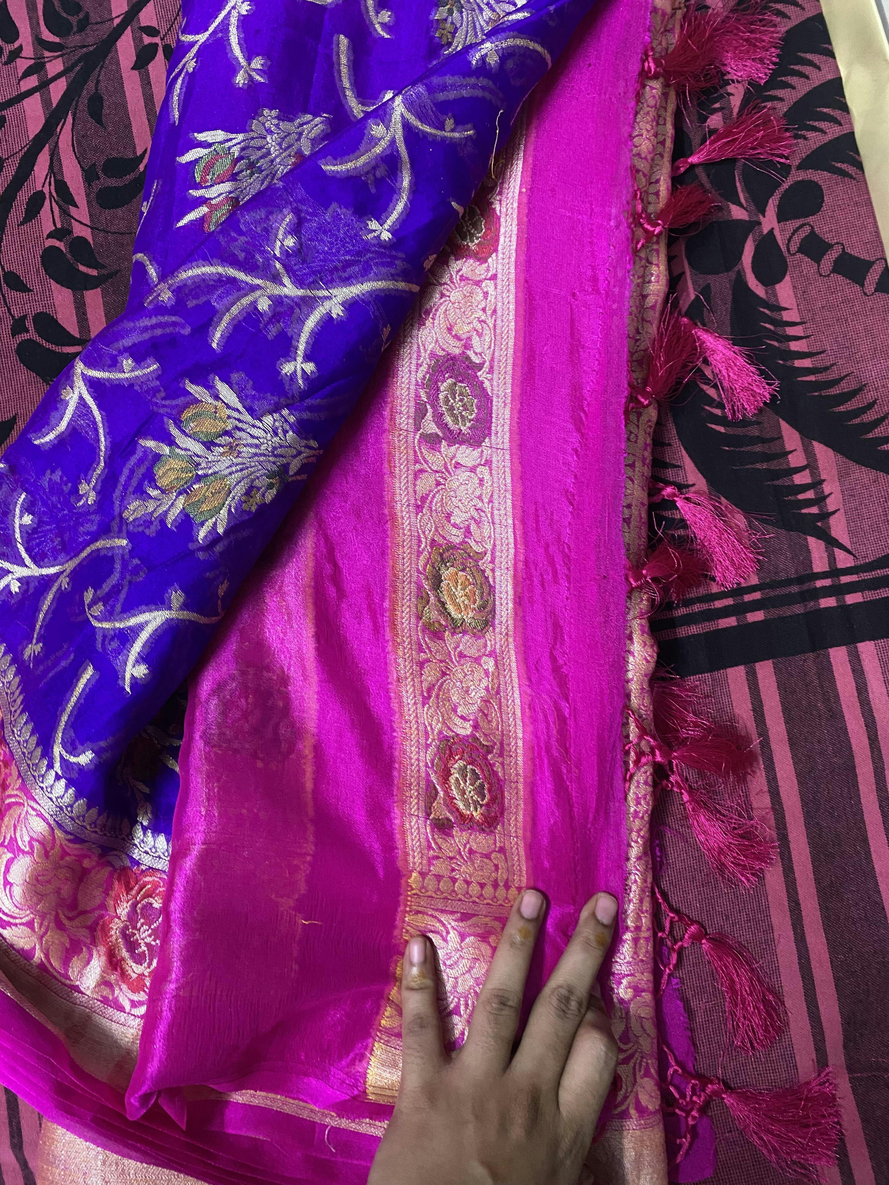 A Beautiful Khaddi Chiffon Banarasi Saree Adorned Zari work all over. It's an elegant classic Banarasi masterpiece. This free-flowing chiffon saree gives a charming and alluring look on drape.