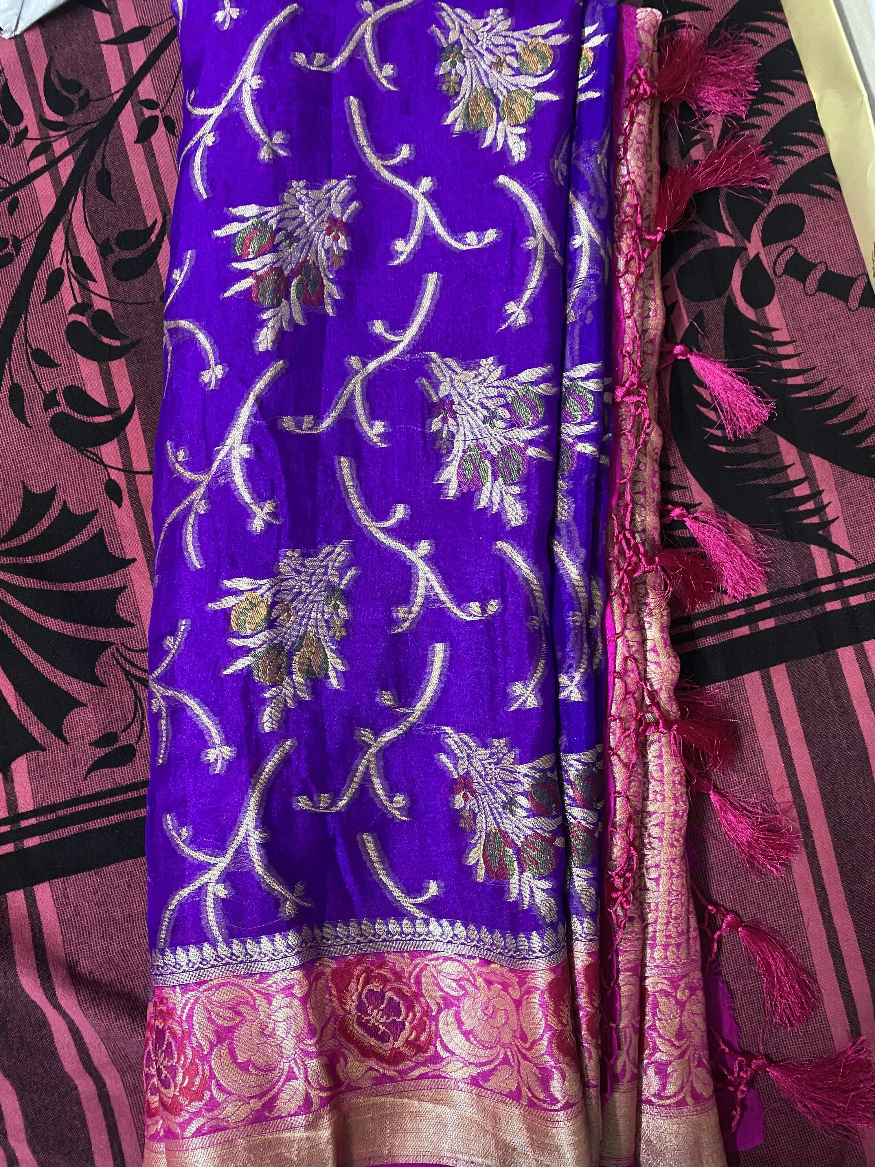 A Beautiful Khaddi Chiffon Banarasi Saree Adorned Zari work all over. It's an elegant classic Banarasi masterpiece. This free-flowing chiffon saree gives a charming and alluring look on drape.