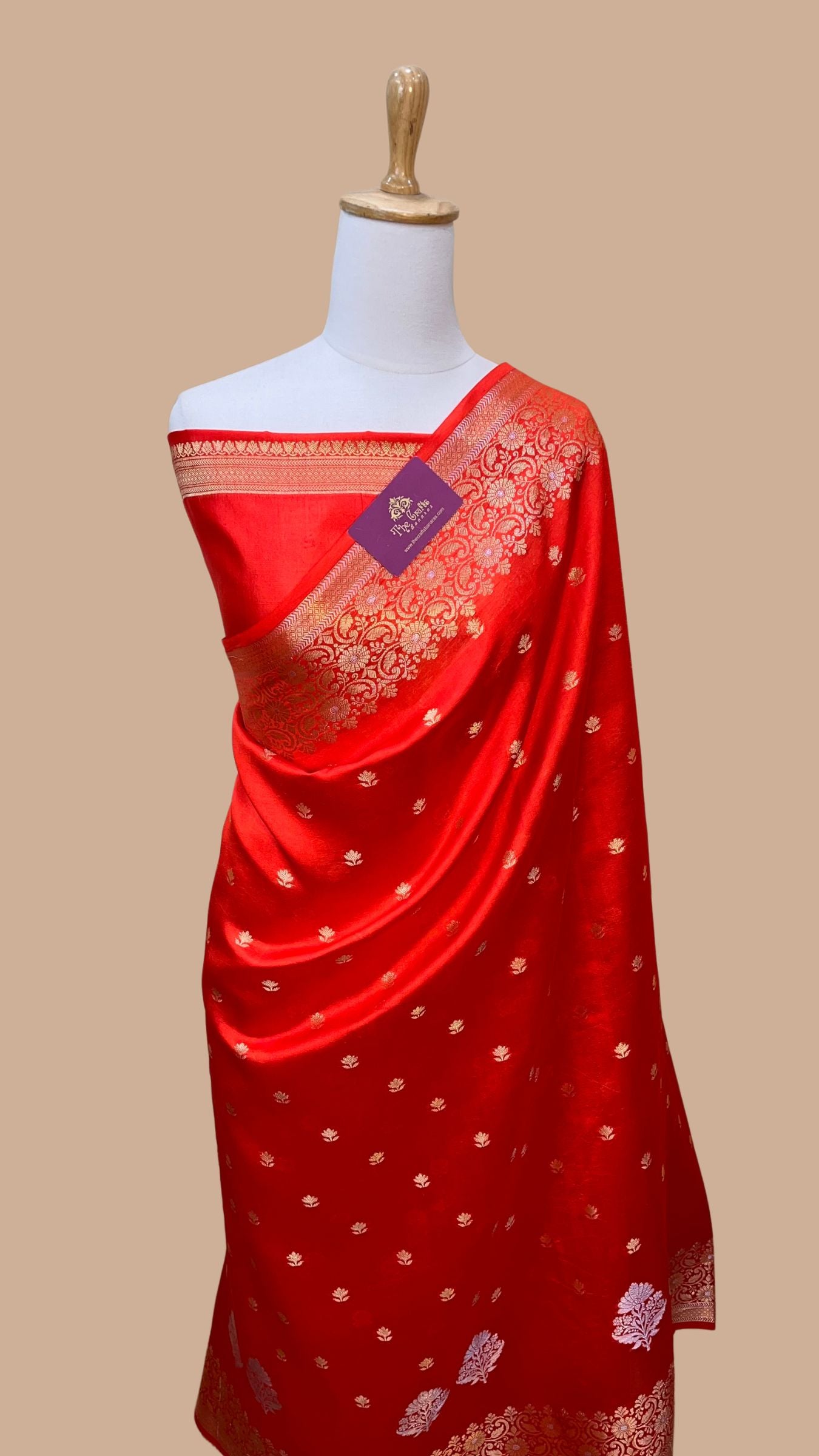 • Speciality - The glorious outline of Zari border lovingly handwoven on a base of resplendent silk in Sona or Gold zari motifs. Incredible in its details and a mirror to the splendour of Banaras.