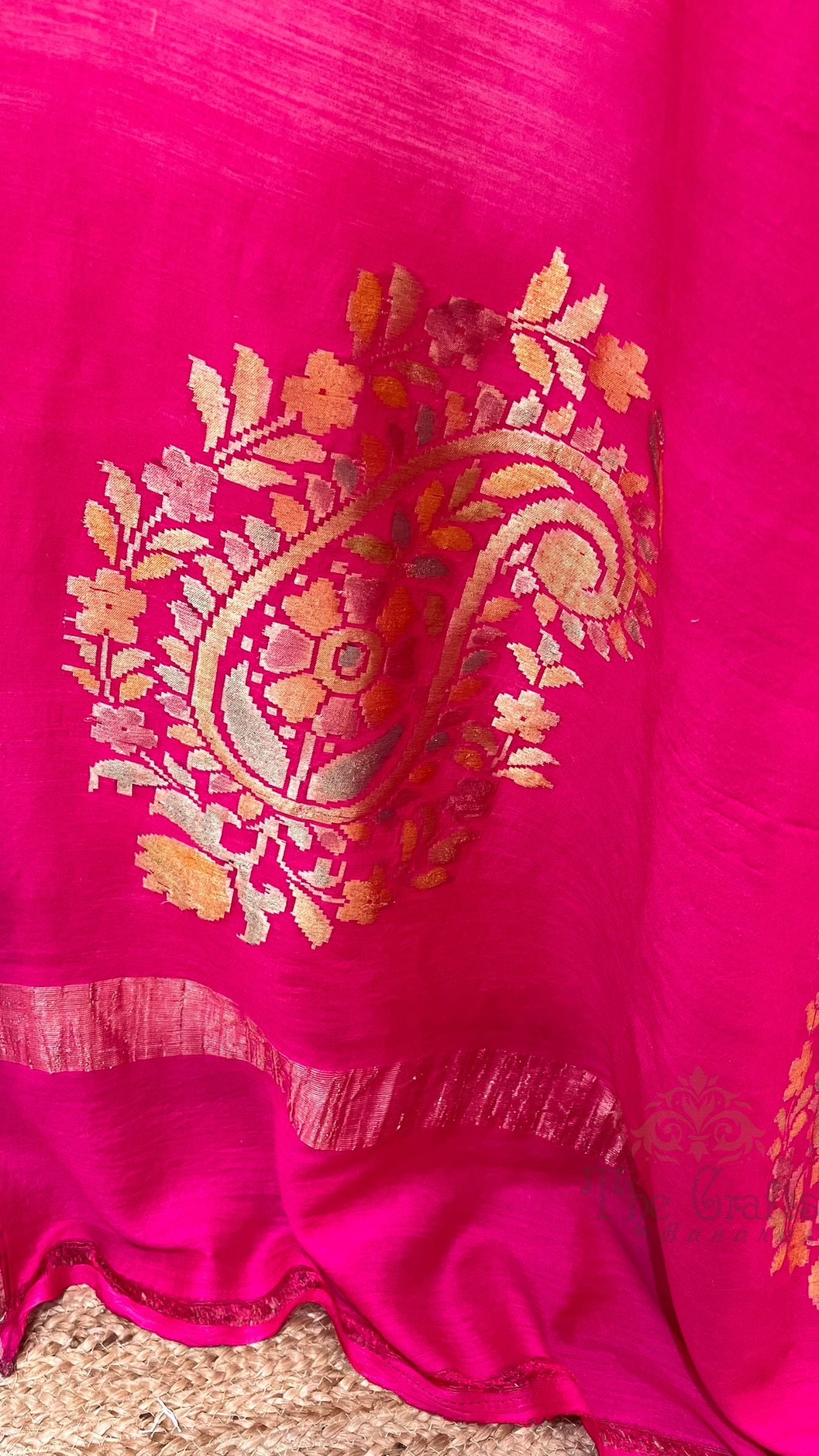 • Technique - An enduring Kadwa weave. The elaborate and laborious Kadwa (Kadhua) technique involves hand-weaving each motif separately. It takes longer on the handloom, but makes a more robust pattern which stands out on the fabric.